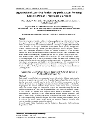 | Uncontrolled Keywords: | Adobe flash, Hypothetical learning trajectory, Peluang, Permainan tradisional Ular Naga; PMRI |