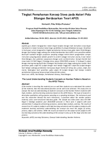 Novianti and Fika Widya Pratama (2022) Tingkat pemahaman konsep siswa pada materi pola bilangan berdasarkan teori APOS. Mosharafa: Jurnal Pendidikan Matematika, 11 (2): 6. pp. 237-246. ISSN 2086-4280