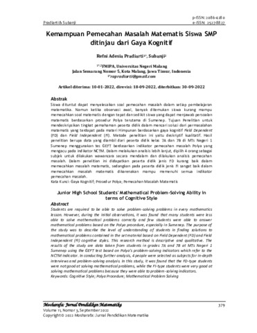 Refni, Adesia Pradiarti and Subanji, Subanji (2022) Kemampuan pemecahan masalah matematis siswa SMP ditinjau dari gaya kognitif. Mosharafa: Jurnal Pendidikan Matematika, 11 (3): 4. pp. 379-390. ISSN 2086-4280