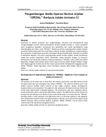 Anisa, Sholikhah and Novisita, Ratu (2022) Pengembangan media operasi bentuk aljabar “OPERAL” berbasis adobe animate CC. Mosharafa: Jurnal Pendidikan Matematika, 11 (3): 15. pp. 507-516. ISSN 2086-4280