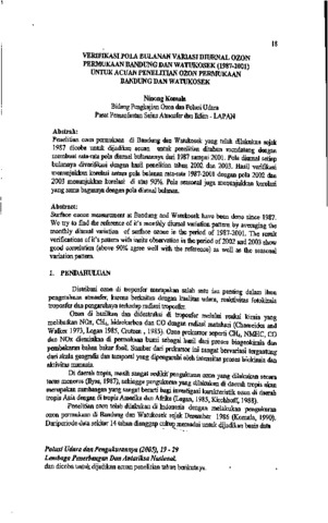 Penelitian ozon permukaan di Bandung dan Watukosek yang telah dilakukan sejak 1987 dicoba untuk dijadikan acuan untuk penelitian ditahun mendatang dengan membuat rata-rata pola diurnal bulanannya dari 1987 sampai 2001. Pola diurnal setiap bulannya diverifikasi dengan hasil penelitian tahun 2002 dan 2003. Hasil verifikasi menunjukkan korelasi antara pola bulanan rata-rata 1987-2001 dengan pola 2002 dan 2003 menunjukkan korelasi di atas 90%. Pola seasonal juga menunjukkan korelasi yang sama bagusnya dengan pola diurnal bulanan.