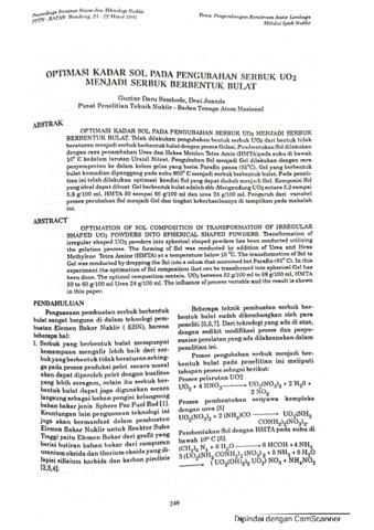Telah dilakukan pengubahan bentuk serbuk UO₂ dari bentuk tidak beraturan menjadi serbuk berbentuk bulat dengan proses Gelasi. Pembentukan Sol dilakukan dengan cara penambahan Urea dan Heksa Metilen Tetra Amin (HMTA)pada suhu di bawah 10° C ke dalam larutan Uranil Nitrat. Pengubahan Sol menjadi Gel dilakukan dengan cara penyemprotan ke dalam kolom gelas yang berisi Parafin panas (95°C). Gel yang berbentuk bulat kemudian dipanggang pada suhu 800° C menjadi serbuk berbentuk bulat. Pada penelitian ini telah dilakukan optimasi kondisi Sol yang dapat diubah menjadi Gel. Komposisi Sol yang ideal dapat dibuat Gel berbentuk bulat adalah sbb :Mengandung UO₂ antara 5,2 sampai 5,8 g/100 ml, HMTA 50 sampai 60 g/100 ml dan urea 24 g/100 mi. Pengaruh dari variabel proses perubahan Sol menjadi Gel dan tingkat keberhasilannya di tampilkan pada makalah ini.