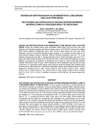 SINTESIS DAN SERTIFIKASI BAHAN ACUAN BERSERTIFIKAT (CRM) ZIRKONIA HASIL OLAH PASIR ZIRKON. Sintesis dan sertifikasi bahan acuan bersertifikat (CRM) zirkonia hasil olah pasir zirkon perlu dilakukan untuk mendukung kegiatan pilot plant pembuatan zirkonia di PSTA-BATAN. Sintesis dan sertifikasi CRM zirkonia dilakukan menggunakan bahan baku zirkonium oksid klorida hasil olah pasir zirkon Kalimantan. Zirkonium oksid klorida dilarutkan dengan aquadest (1:10), ditambah ammonia pada pH 10, maka terbentuk endapan zirkonium hidroksida. Zirkonium hidroksida dipanaskan pada suhu 110 oC dan dilakukan kalsinasi pada suhu 900 oC, sehingga diperoleh zirkonia. Zirkonia dikeringkan pada suhu 110 oC, digerus dan diayak sampai diperoleh ukuran butir lolos 200 mesh. Serbuk zirkonia dihomogenkan, kemudian dilakukan uji homogenasi, uji stabilisasi, uji karakterisasi dan uji kadar air. Pada evaluasi data diperoleh kandidat CRM zirkonia sudah homogen, stabil,.mengandung mineral baddeleyite yang monoklin dan kadar air lebih kecil 1 %. Disimpulkan serbuk zirkonia sudah memenuhi syarat fisik sebagai CRM. Sertifikat hasil uji parameter dalam CRM zirkonia dari 7 laboratorium terakreditasi dengan metode statistik diperoleh 9 oksida, adalah ZrO2 : (95,422± 0,027) % ; HfO2 : (1,443 ± 0,004) % ; SiO2:(0,535 ± 0,002) % ; Al2O3 : (0,362 ± 0,012) %; Fe2O3: (0,028 ± 0,003) % ; TiO2 : (0,026 ± 0,001) %; Na2O : (0,262 ± 0,026) %; Nd2O3 : (0,0367± 0,007) %; CeO2 : (0,131 ± 0,013) %. Sertifikasi ini tertelusur ke BCS-CRM No. 358 zirconia buatan BAS-Perancis.