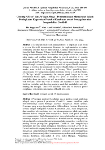 Ike, Anggraeni and Muh., Azmi Muhidin and Alfina, Suci Ramadhani (2022) Centang "Bissa” dan Pa’Jaga Masiji: pemberdayaan masyarakat dalam peningkatan kepatuhan protokol kesehatan untuk pencegahan dan pengendalian Covid-19. Jurnal ABDINUS: Jurnal Pengabdian kepada Masyarakat, 6 (2): 2. pp. 285-295. ISSN 2599-0764