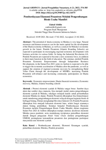 Zainal, Abidin (2022) Pemberdayaan ekonomi pesantren melalui pengembangan bisnis usaha mandiri. Jurnal ABDINUS: Jurnal Pengabdian kepada Masyarakat, 6 (2): 12. pp. 374-385. ISSN 2599-0764
