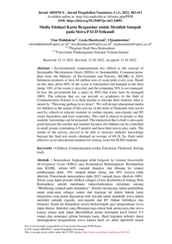 Vina, Mahdalena and Lusia, Handayani and Uljanatunnisa, Uljanatunnisa (2022) Media edukasi kartu bergambar untuk memilah sampah pada siswa PAUD Srikandi. Jurnal ABDINUS: Jurnal Pengabdian kepada Masyarakat, 6 (2): 15. pp. 402-411. ISSN 2599-0764