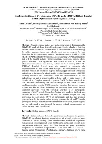 Indah, Lestari and Shumaya, Resty Ramadhani and Muhammad, Arif Fadhly Ridha and Dwi, Listiyanti (2022) Implementasi Google for Education (GAFE) pada SDIT Al-Ittihad Rumbai untuk optimalisasi pembelajaran daring. Jurnal ABDINUS: Jurnal Pengabdian kepada Masyarakat, 6 (2): 18. pp. 430-441. ISSN 2599-0764