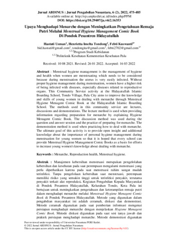 Hastuti, Usman and Henrietta, Imelta Tondong and Febti, Kuswanti (2022) Upaya menghadapi menarche dengan meningkatkan pengetahuan remaja putri melalui menstrual hygiene management comic book di Pondok Pesantren Hidayatullah. Jurnal ABDINUS: Jurnal Pengabdian kepada Masyarakat, 6 (2): 23. pp. 475-485. ISSN 2599-0764