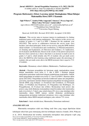 Sigit, Wibowo and Sandra, Prilia Anggraini and Sunaryo, Sunaryo and Wecya, Sugevin and Rima, Cahya Nirwana and Yuniawatika, Yuniawatika (2022) Program mathematics ethnic learning untuk meningkatan minat belajar matematika siswa SDN 1 Kauman. Jurnal ABDINUS: Jurnal Pengabdian kepada Masyarakat, 6 (2): 27. pp. 520-530. ISSN 2599-0764
