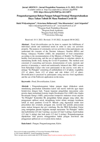 Bakti, Widyaningrum and Octaviana, Helbawanti and Nisa, Khoerunisa and Astri, Srigustini (2022) Penganekaragaman bahan pangan sebagai strategi mempertahankan daya tahan tubuh di masa pandemi Covid-19. Jurnal ABDINUS: Jurnal Pengabdian kepada Masyarakat, 6 (2): 28. pp. 531-541. ISSN 2599-0764