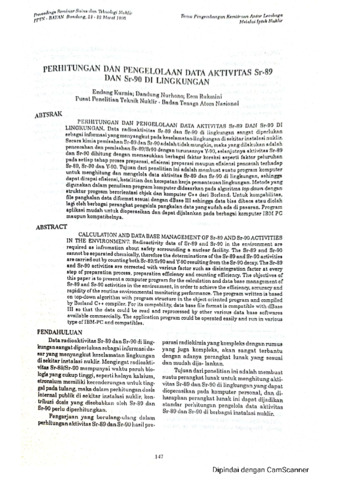 Data radioaktivitas Sr-89 dan Sr-90 di lingkungan sangat diperlukan sebagai informasi yang menyangkut pada keselamatan lingkungan di sekitar instalasi nuklir.Secara kimia pemisahan Sr-89 dan Sr-90 adalah tidak mungkin, maka yang dilakukan adalah pencacahan dan pemisahan Sr-89/Sr-90 dengan turunannya Y-90. Selanjutnya aktivitas Sr-89 dan Sr-90 dihitung dengan memasukkan berbagai faktor koreksi seperti faktor peluruhan pada setiap tahap proses preparasi, efisiensi preparasi maupun efisiensi pencacah terhadap Sr-89, Sr-90 dan Y-90. Tujuan dari penelitian ini adalah membuat suatu program komputer untuk menghitung dan mengelola data aktivitasi Sr-89 dan Sr-90 di lingkungan, sehingga dapat dicapai efisiensi, ketelitian dnn kecepatan kerja pemantauan lingkungan. Metode yang digunakan dalam penulisan program komputer didasarkan pada algoritma top down dengan struktur program berorientasi objek dan komputer C++ dari Borland. Untuk kompabilitas, file pangkalan data diformat sesuai dengan dBase III sehingga data bisa dibaca atau diolah lagi oleh berbagai perangkat pengolola pangkalan data yang sudah ada dì pasaran. Program aplikasi mudah untuk dioperasikan dan dapat dijalankan pada berbagai komputer IBM PC maupun kompatibelnya.
