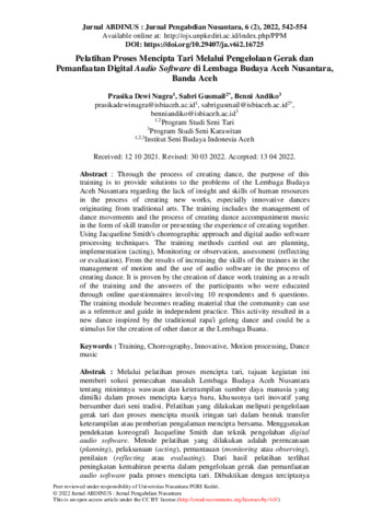 Prasika, Dewi Nugra and Sabri, Gusmail and Benni, Andiko (2022) Pelatihan proses mencipta tari melalui pengelolaan gerak dan pemanfaatan digital audio software di Lembaga Budaya Aceh Nusantara, Banda Aceh. Jurnal ABDINUS: Jurnal Pengabdian kepada Masyarakat, 6 (2): 29. pp. 542-554. ISSN 2599-0764