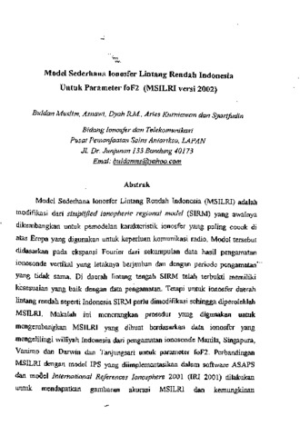 Model Sederhana Ionosfer Lintang Rendah Indonesia (MSILRI) adalah modifikasi dari simplified ionopheric regional model (SIRM) yang awalnya dikembangkan untuk pemodelan karakteristik ionosfer yang paling cocok di atas Eropa yang digunakan untuk keperluan komunikasi radio. Model tersebut didasarkan pada ekspansi Fourier dari sekumpulan data hasil pengamatan ionosonde vertikal yang letaknya berjauhan dan dengan periode pengamatan"' yang tidak sama. Di daerah lintang tengah SIRM telah terbukti memiliki kesesuaian yang baik dengan data pengamatan. Tetapi untuk ionosfer daerah lintang rendah seperti Indonesia SIRM perlu dimodifikasi sehingga diperolehlah MSILRI. Makalah ini menerangkan prosedur yang digunakan untuk mengembangkan MSILRI yang dibuat berdasarkan data ionosfer yang mengelilingi wirayah Indonesia dan pengamatan ionosonde Manila, Singapura, Vanimo dan Darwin dan Tanjungsari untuk parameter foF2. Perbandingan MSILRI dengan model IPS yang diimplementasikan dalam software ASAPS dan model International References Ionosphere 2001 (IRI 2001) dilakukan untuk mendapatkan gambaran akurasi MSILRI dan kemungkinan pengembangan MSILRI agar memiliki tingkat akurasi yang lebih baik dari model global yang sudah ada.