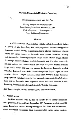 Analisis harmonik telah dilakukan terhadap data frekuensi kritis lapisan F2 (foF2) di atas Sumedang dari hasil pengamatan ionosfer menggunakan ionosonde vertikal. Analisis menunjukkan bahwa rata-rata bulanan dari rata-rata harian dan empat komponen harmonik yang pertama bervariasi terhadap aktivitas matahari dan memperlihatkan adanya variasi tahunan, tengah tahunan dan adanya asimetri ekuinok. Analisis harmonik juga diterapkan untuk nilai rata-rata bulanan dari rata-rata harian dan empat komponen tersebut terhadap fungsi bulan. Model nilai rata-rata bulanan dan komponen harmonik tersebut kemudian diestimasi secara linier dalam hubungannya dengan tingkat aktivitas matahari tahunan. Dengan analisis korelasi antara koefisien fungsi harmonik yang diperoleh terhadap indek aktivitas matahari maka dapat diketahui sejauh mana analisis harmonik dapat digunakan untuk pemodelan ionosfer di atas Sumedang, interpolasi dan ekstrapolasi data foF2 di atas Sumedang.