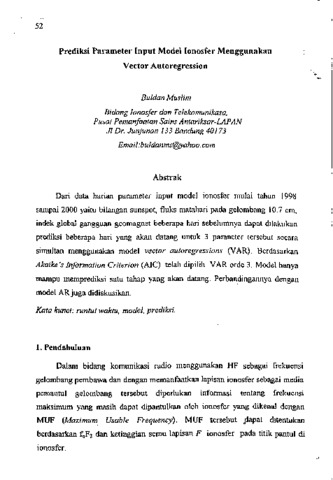 Dari data harian parameter input model ionosfer mulai tahun 1998 sampai 2000 yaitu bilangan sunspot, fluks matahari pada gelombang 10.7 cm, indek global gangguan geomagnet beberapa hari sebelumnya dapat dilakukan prediksi beberapa hari yang akan datang untuk 3 parameter tersebut secara simultan menggunakan model vector autoregressions (VAR). Berdasarkan Akaike's Information Criterion (AIC) telah dipilih VAR orde 3. Model hanya mampu memprediksi satu tahap yang akan datang. Perbandingannya dengan model AR juga didiskusikan.