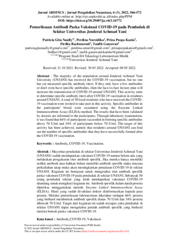 Patricia Gita Naully and Perdina Nursidika and Prina Puspa Kania and Firdha Rachmawati and Taufik Gunawan (2022) Pemeriksaan antibodi paska vaksinasi Covid-19 pada penduduk di sekitar Universitas Jenderal Achmad Yani. Jurnal ABDINUS: Jurnal Pengabdian kepada Masyarakat, 6 (3): 1. pp. 566-572. ISSN 2599-0764