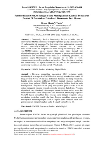 Firman, Mansir and Tumin, Tumin (2022) Pemberdayaan UMKM sebagai usaha meningkatkan kualitas pemasaran produk di Padukuhan Dukuhsari Wonokerto Turi Sleman. Jurnal ABDINUS: Jurnal Pengabdian kepada Masyarakat, 6 (3): 11. pp. 656-664. ISSN 2599-0764