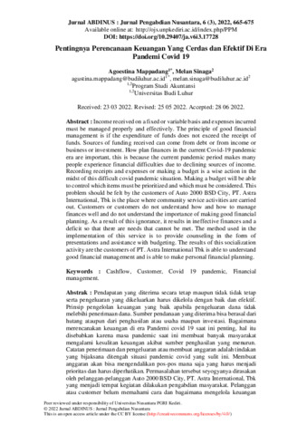 Agoestina, Mappadang and Melan, Sinaga (2022) Pentingnya perencanaan keuangan yang cerdas dan efektif di era pandemi Covid-19. Jurnal ABDINUS: Jurnal Pengabdian kepada Masyarakat, 6 (3): 12. pp. 665-675. ISSN 2599-0764