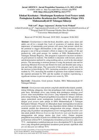 Widi Arti and Bagas Anjasmara and Herista Novia Widanti (2022) Edukasi kesehatan: membangun kesadaran good posture untuk peningkatan kualitas kesehatan dan produktifitas pelajar SMA Muhmamadiyah 03 Tulangan Sidoarjo. Jurnal ABDINUS: Jurnal Pengabdian kepada Masyarakat, 6 (3): 13. pp. 676-682. ISSN 2599-0764