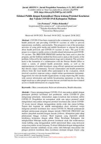 Lies, Permana and Widiya, Rolantika (2022) Edukasi publik dengan komunikasi massa tentang protokol kesehatan dan vaksin Covid-19 di Kabupaten Malinau. Jurnal ABDINUS: Jurnal Pengabdian kepada Masyarakat, 6 (3): 14. pp. 683-697. ISSN 2599-0764