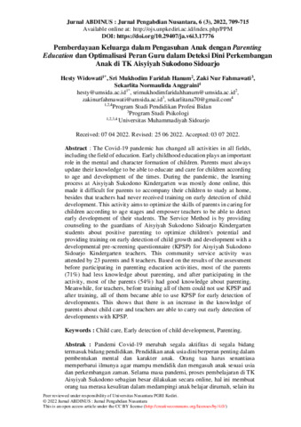 Hesty Widowati and Sri Mukhodim Faridah Hanum and Zaki Nur Fahmawati and Sekarlita Normaulida Anggraini (2022) Pemberdayaan keluarga dalam pengasuhan anak dengan parenting education dan optimalisasi peran guru dalam deteksi dini perkembangan anak di TK Aisyiyah Sukodono Sidoarjo. Jurnal ABDINUS: Jurnal Pengabdian kepada Masyarakat, 6 (3): 16. p. 709. ISSN 2599-0764