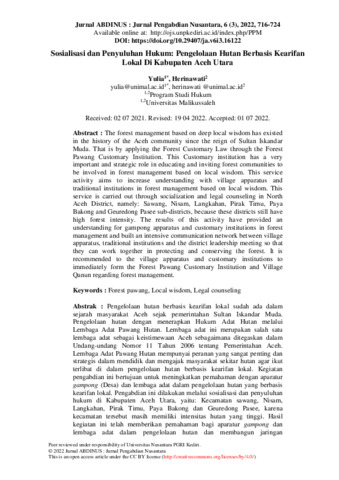 Yulia and Herinawati (2022) Sosialisasi dan penyuluhan hukum: pengelolaan hutan berbasis kearifan lokal di Kabupaten Aceh Utara. Jurnal ABDINUS: Jurnal Pengabdian kepada Masyarakat, 6 (3): 17. pp. 716-724. ISSN 2599-0764