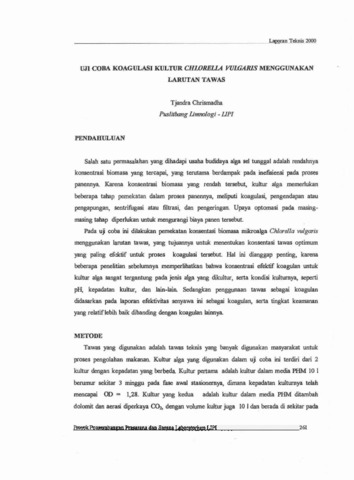 Tjandra, Chrismadha (2000) Uji coba koagulasi kultur Chlorella vulgaris menggunakan larutan tawas. Technical Report. Puslitbang Limnologi LIPI.
