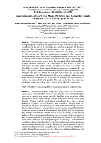 Raditya, Pratama Putra and Anne, Maryani and Ike, Junita Triwardhani and Indri, Rachmawati (2022) Pengembangam softskill social media marketing bagi komunitas wanita disabilitas (HWDI Provinsi Jawa Barat). Jurnal ABDINUS: Jurnal Pengabdian kepada Masyarakat, 6 (3): 22. pp. 761-772. ISSN 2599-0764