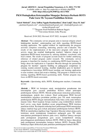 Yakob, Metboki and Erny, Selfina Nggala Hambandima and Ifoni, Ludji and Sisca, M. Sula (2022) PKM peningkatkan keterampilan mengajar bertanya berbasis HOTS pada guru TK Yayasan Pendidikan Kristen. Jurnal ABDINUS: Jurnal Pengabdian kepada Masyarakat, 6 (3): 23. pp. 773-785. ISSN 2599-0764