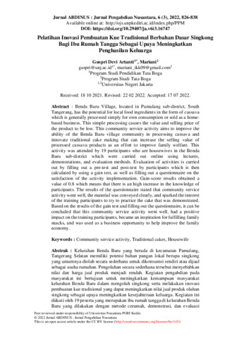 Kelurahan Benda Baru yang berada di kecamatan Pamulang, Tangerang Selatan memiliki potensi bahan pangan lokal berupa singkong yang umumnya diolah secara sederhana untuk dikonsumsi sendiri atau dijual sebagai usaha rumahan. Pengolahan secara sederhana tersebut menyebabkan nilai dan harga jual produk menjadi rendah. Kegiatan pengabdian pada masyarakat ini bertujuan untuk meningkatkan kemampuan masyarakat kelurahan Benda Baru dalam mengolah singkong serta melakukan inovasi pembuatan kue tradisional yang dapat meningkatkan nilai jual produk olahan singkong sebagai upaya meningkatkan kesejahteraan keluarga. Kegiatan ini diikuti oleh 19 peserta yang merupakan ibu rumah tangga di kelurahan Benda Baru yang dilakukan dengan metode ceramah, demonstrasi, dan evaluasi secara daring. Evaluasi kegiatan dilakukan dengan pengisian pre-test dan post-test oleh peserta kegiatan yang kemudian dihitung dengan uji gain, serta pengisian angket kepuasan pelaksanaan kegiatan oleh peserta. Hasil Gainscore diperoleh nilai sebesar 0,8 yang artinya terdapat peningkatan pengetahuan peserta berada pada kategori tinggi. Hasil pengisian angket oleh peserta kegiatan menyatakan bahwa kegiatan berjalan dengan baik, materi tersampaikan dengan jelas, dan memicu minat peserta pelatihan untuk mencoba mempraktekan kue yang di demonstrasikan. Berdasarkan hasil uji gain dan pengisian angket dapat disimpulkan bahwa kegiatan pengabdian masyarakat ini berjalan baik, berdampak positif bagi peserta pelatihan, menjadi inspirasi pemenuhan kudapan keluarga, serta dijadikan peluang usaha untuk membantu meningkatkan ekonomi keluarga.