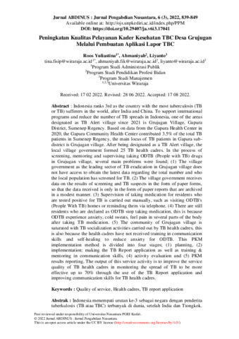 Roos, Yuliastina and Ahmaniyah, Ahmaniyah and Liyanto, Liyanto (2022) Peningkatan kualitas pelayanan kader kesehatan TBC Desa Grujugan melalui pembuatan aplikasi lapor TBC. Jurnal ABDINUS: Jurnal Pengabdian kepada Masyarakat, 6 (3): 29. pp. 839-849. ISSN 2599-0764