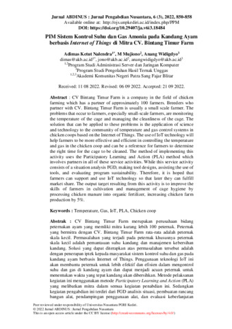 Adimas, Ketut Nalendra and M, Mujiono and Anang, Widigdyo (2022) PIM sistem kontrol suhu dan gas amonia pada kandang ayam berbasis internet of things di Mitra CV. Bintang Timur Farm. Jurnal ABDINUS: Jurnal Pengabdian kepada Masyarakat, 6 (3): 30. pp. 850-858. ISSN 2599-0764