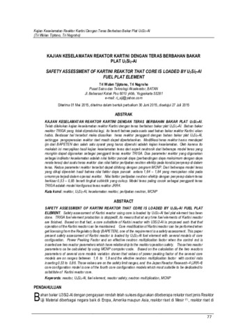 KAJIAN KEKRITISAN REAKTOR KARTINI DENGAN TERAS BERBAHAN BAKAR PLAT U3Si2-Al. Telah dilakukan kajian kekritisan reaktor Kartini dengan teras Berbahan bakar plat U3Si2-Al. Di dalam makalah ini disajikan hasil kajian kekritisan teras dari aspek neutronik dari beberapa model teras yang mungkin dapat digunakan sebagai pengganti teras reaktor Kartini. Dua parameter reaktor yang digunakan sebagai indikator keselamatan adalah nila faktor puncak daya (perbandingan daya maksimum dengan daya rerata teras) dari suatu teras reaktor dan nilai faktor perlipatan neutron efektip pada kondisi penyerap di dalam teras. Kedua parameter reaktor tersebut dapat dihitung dengan program MCNP. Dari beberapa model teras yang dikaji diperoleh hasil bahwa nilai faktor daya puncak antara 1,64 – 1,84 yang merupakan nilai pada umumnya terjadi dalam operasi reaktor. Nilai faktor perlipatan neutron efektip dengan penyerap dalam teras berkisar 0,53 – 0,85 berarti tingkat subkrtik yang cukup. Model teras paling cocok sebagai pengganti teras TRIGA adalah model konfigurasi teras reaktor JRR4.