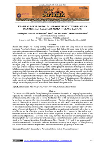 | Uncontrolled Keywords: | Hukum Adat Megou Pa’, Upaya Preventif, Kehamilan diluar Nikah |