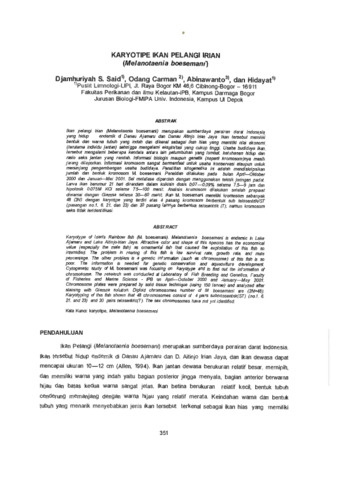 lkan pelangi lrian (Melanotaenia boesemani) merupakan sumberdaya perairan darat Indonesia yang hidup endemik di Danau Ajamaru dan Danau Aitinjo Arian Jaya lkan tersebut memiliki bentuk dan warna tubuh yang indah dan dikenal sebagai ikan hias yang memiliki nilai ekonomi (terutama individu jantan) sehingga mengalami eksploitasi yang cukup tinggi Usaha budidaya ikan tersebut mengalami beberapa kendala antara lain petumbuhan yang lambat, ketahanan hidup dan rasio seks jantan yang rendah. Informasi biologis maupun genetik (seperti kromosom)nya masih jarang dilaporkan. Informasi kromosom sangat bermanfaat untuk usaha konservasi ataupun untuk menunjang pengembangan usaha budidaya. Penelitian sitogenetika ini adalah mendiskripsikan jumlah dan bentuk kromosom M. boesemani. Penelitian dilakukan pada bulan April-Oktober 2000 dan Januari---Mei 2001. Sel metalase diperoleh dengan menggunakan teknik janingan padat. Larva ikan berumur 21 har direndam dalam kolkisin dosis 0.07--0,09% selama 7.5--9 jam dan hipotonik 0.075M KCI selama 75-100 menit. Analisis kromosom dilakukan setelah preparate diwarnai dengan Giemsa selama 30-60 menit. Jkan M. boesemani memiliki kromosom sebanyak 48 (2N) dengan karyotipe yang terdiri atas 4 pasang kromosom berbentuk sub telosentrik/ST (pasangan no.1, 6. 21, dan 23) dan 20 pasang lainnya berbentuk telosentrik (T). namun kromosom seks tidak teridentifkasi.