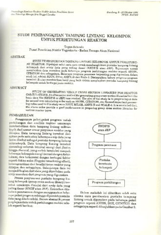 Dipelajari salah satu cara untuk membangkitkan pustaka tampang lintang kelompok dari arsip data yang paling dasar (ENDF/B atau JEF). Tujuannya untuk menyiapkan data masukan pada beberapa program perhitungan reaktor seperti ANISN, CITATION dan sebagainya. Beberapa program perroses terpenting yang digunskan dalam studi ini, adalah NJOY, Miler, AMPX-II dan Scale-3. Disimpulkan bahwa program-program tersebut di atas memberikan hasil yang baik dalam menyiapkan pustaka tampang lintang kelompok untuk berbagai jenis reaktor.