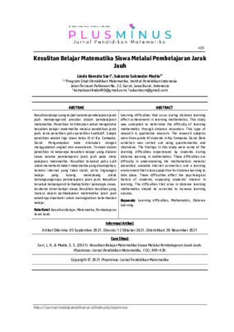 Linda, Komala Sari and Sukanto, Sukandar Madio (2021) Kesulitan belajar matematika siswa melalui pembelajaran jarak jauh. Plusminus: Jurnal Pendidikan Matematika, 1 (3): 3. pp. 409-420. ISSN 2798-2904