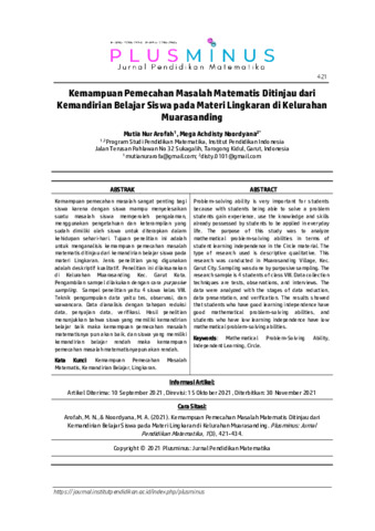 Mutia, Nur Arofah and Mega, Achdisty Noordyana (2021) Kemampuan pemecahan masalah matematis ditinjau dari kemandirian belajar siswa pada materi lingkaran di Kelurahan Muarasanding. Plusminus: Jurnal Pendidikan Matematika, 1 (3): 4. pp. 421-434. ISSN 2798-2904