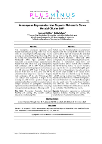 Ismawati Rahlan and Deddy Sofyan (2021) Kemampuan representasi dan disposisi matematis siswa melalui CTL dan SAVI. Plusminus: Jurnal Pendidikan Matematika, 1 (3): 10. pp. 493-504. ISSN 2798-2904