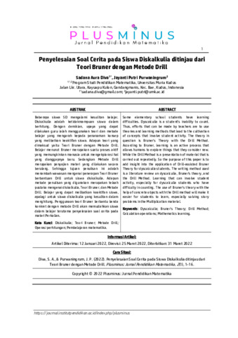 Sadana, Aura Diva and Jayanti, Putri Purwaningrum (2022) Penyelesaian soal cerita pada siswa diskalkulia ditinjau dari teori bruner dengan metode drill. Plusminus: Jurnal Pendidikan Matematika, 2 (1): 1. pp. 1-16. ISSN 2798-2904