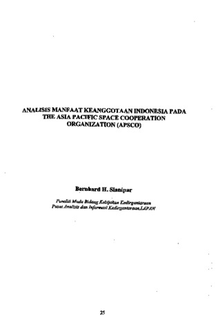 Indonesia merupakan salah satu Negara yang telah lama memanfaatkan teknologi antariksa dalam pelaksanaan pembangunan nasionalnya. Pembangunan tersebut dilakukan -oleh bebeiapa institusi national, balk yang dilakukan instansi pemerintah maupun swasta, serta perguruan tinggi. Untuk mengetahui manfaat yang mungkin dapat diperoleh Indonesia bila masuk menjadi angsota APSCO, maka perlu ditinjau terlebih dulu program-program yang akan dilalcsanakan APSCO. Dengan melihat rencana program yang akan dilaksanakan, maka dapat disusun matriks institusi-institusi yang mungkin dapat memperoleh manfaat dari pelaksanaan program tersebut sesuai dengan tugas dan fungsi atau kegiatan yang dilakukan oleh masing-masing institusi.