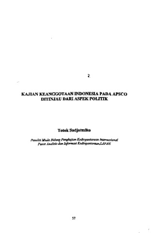 Keanggotaan Indonesia pada organisasi internasional merupakan bagian dari perjuangan mengejar kepentingan nasional. Dikaitkan dengan pembentukan APSCO sebagai organisasi kerjasama keihtariksaan yang bersifat multilateral, Indonesia dapat mengejar kepentingan nasional dengan membangun hubungan dengan kawasan secara keseluruhan. Aturan .tentang keanggotan dan keikut sertaan Indonesia di organisasi internasional mensyaratkan beberapa manfaat yang perlu dipenuhi. Salah satu manfaat itu adalah manfaat diibidang politik. Makalah ini disusun dengan mempertimbangkan APSCO sebagai kerjasama multilateral dan berusaha menjawab manfaat keanggotaan Indonesia pada APSCO dilihat dari aspek politik