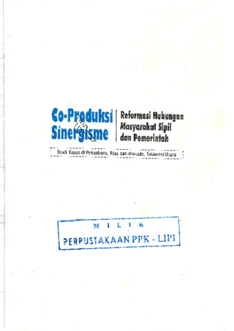 Dundin, Zaenuddin and Rusydi, Syahra and Suprihadi, Suprihadi and I Ketut, Ardhana (2006) Co-produksi & sinergisme: reformasi hubungan masyarakat sipil dan pemerintah (studi kasus di Pekanbaru, Riau dan Manado, Sulawesi Utara). LIPI Press, Jakarta. ISBN 979-26-2484-8