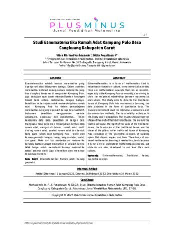 Wina, Fitriani Nurhasanah and Nitta, Puspitasari (2022) Studi etnomatematika rumah adat Kampung Pulo Desa Cangkuang Kabupaten Garut. Plusminus: Jurnal Pendidikan Matematika, 2 (1): 3. pp. 27-38. ISSN 2798-2904