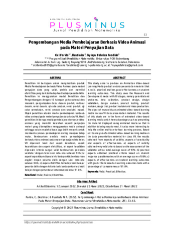 Cici, Farida and Destiniar, Destiniar and Nyiayu, Fahriza Fuadiah (2022) Pengembangan media pembelajaran berbasis video animasi pada materi penyajian data. Plusminus: Jurnal Pendidikan Matematika, 2 (1): 5. pp. 53-66. ISSN 2798-2904