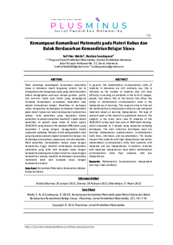 Sufi, Nur Hakiki and Rostina, Sundayana (2022) Kemampuan komunikasi matematis pada materi kubus dan balok berdasarkan kemandirian belajar siswa. Plusminus: Jurnal Pendidikan Matematika, 2 (1): 9. pp. 101-110. ISSN 2798-2904