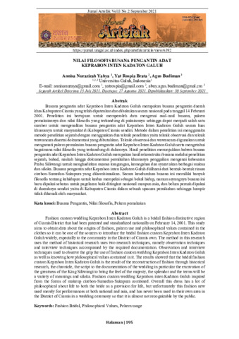 Annisa, Nurazizah Yahya and Yat, Rospia Brata and Agus, Budiman (2021) Nilai filosofis busana pengantin adat Keprabon Inten Kadaton Galuh. Jurnal Artefak, 8 (2). pp. 195-202. ISSN 2355-5726