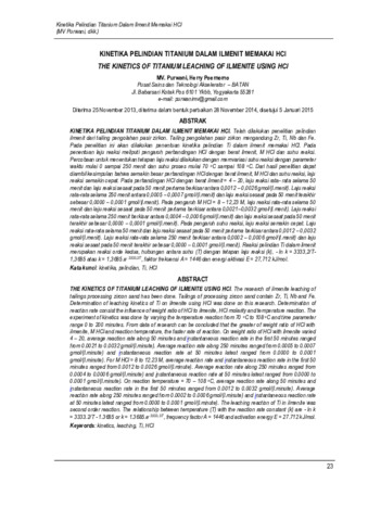 Telah dilakukan penelitian pelindian ilmenit dari tailing pengolahan pasir zirkon. Tailing pengolahan pasir zirkon mengandung Zr, Ti, Nb dan Fe. Pada penelitian ini akan dilakukan penentuan kimetika pelindian (leaching) Ti dalam ilmenit memakai HCl. Pada penentuan laju reaksi meliputi pengaruh perbandingan HCl dengan berat ilmenit, M HCl dan suhu reaksi. Percobaan untuk menentukan tetapan laju reaksi dilakukan dengan memvariasi suhu reaksi dengan parameter waktu mulai 0 sampai 250 menit dan suhu proses mulai 700C sampai 1080C. Dari hasil penelitian pelindian Ti dalam ilmenit memakai HCl, dapat diambil kesimpulan bahwa semakin besar perbandingan HCl dengan berat ilmenit, M HCl dan suhu reaksi, laju reaksi semakin cepat. Laju reaksi pada 50 menit pertama berkisar antara 0,0021 – 0,0032 gmol/l.menit dan laju reaksi pada 250 menit berkisar antara 0,0005 – 0,0007 gmol/l.menit untuk variasi perbandingan HCl dengan berat ilmenit = 4 – 20. Laju reaksi pada 50 menit pertama berkisar antara 0,0012 – 0,0026 gmol/l.menit dan laju reaksi pada 250 menit berkisar antara 0,0004 – 0,0006 gmol/l.menit untuk M HCl = 8 – 12,23 M.. Laju reaksi pada 50 menit pertama berkisar antara 0,0012 – 0,0032 gmol/l.menit dan laju reaksi pada 250 menit berkisar antara 0,0002 – 0,0006 gmol/l.menit pada reaksi = 70 – 1080C. Reaksi pelindian Ti dalam ilmenit merupakan reaksi orde kedua. hubungan antara suhu (T) dengan tetapan laju reaksi (k). ln k = -5383,5/T + 6,6149 atau k = 6,6149.e- 5383,5/T, faktor frekuensi A = 746,130, energi aktivasi E = 44758,419 kj/mol.