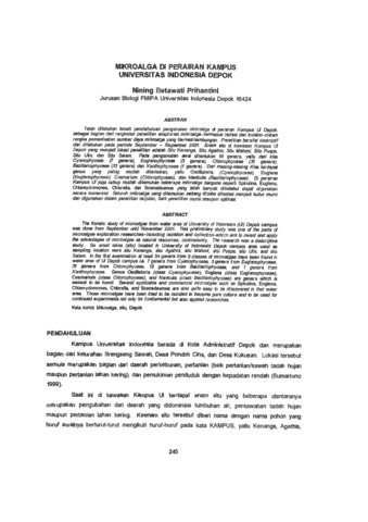 Telah dilakukan telaah pendahuluan pengenalan mikroalga di perairan Kampus UI Depok, sebagai bagian dari rangkaian penelitian eksplorasi mikroalga termasuk isolasi dan koleksi dalam rangka pemanfaatan sumber daya mikroalga yang berkesinambungan. Penelitian bersifat deskriptif dan dilakukan pada periode September -- Nopember 2001. Enam situ di kawasan Kampus Ul Depok yang menjadi lokasi penelitian adalah Situ Kenanga, Situ Agathis, Situ Mahoni, Situ Puspa, Situ Ulin, dan Situ Salam. Pada pengamatan awal ditemukan 54 genera, yaitu dari klas Cyanophyceae (7 genera), Euglenophyceae (3 genera), Chlorophyceae (31 genera), Bacillariophyceae (12 genera) dan Xanthophyceae (1 genera). Dari masing-masing Klas terdapat genus yang paling mudah ditemukan, yaitu Oscillatoria (Cyanophyceae), Euglena (Euglenophyceae), Cosmarium (Chlorophyceae), dan Navicula (Bacillariophyceae). Di perairan Kampus Ul juga cukup mudah ditemukan beberapa mikroalga berguna seperti Spirulina, Euglena, Chlamydomonas, Chlorella, dan Scenedesmus yang telah banyak diketahui dapat digunakan secara komersial. Seluruh mikroalga yang ditemukan sedang dicoba diisolasi menjadi kultur murni dan digunakan dalam penelitian lanjutan, baik penelitian murni maupun aplikasi.