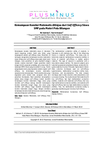 Riri, Indriani and Teni, Sritresna (2022) Kemampuan koneksi matematis ditinjau dari self efficacy siswa SMP pada materi pola bilangan. Plusminus: Jurnal Pendidikan Matematika, 2 (1): 11. pp. 121-130. ISSN 2798-2904